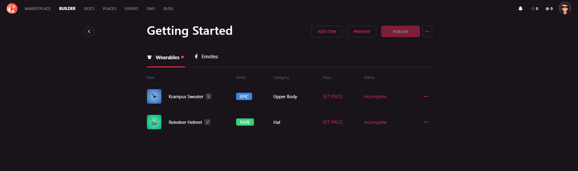 After that uploading your wearables you will end up with a screen like this, that shows the items in your collection.