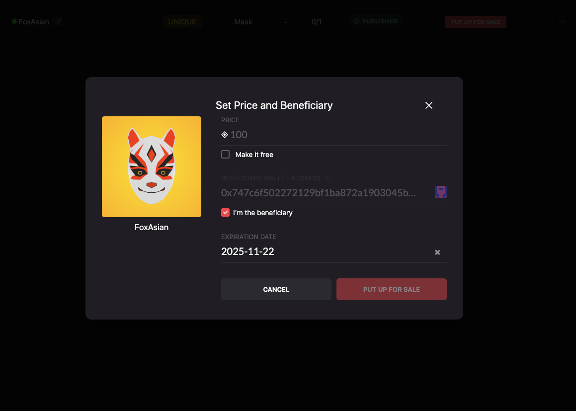 You could also Make it Free, which means that the price will be set as 0 MANA and the beneficiary address will be null. Know that making it free (primary sale) does not prevent it from being sold at any price as a secondary sale.