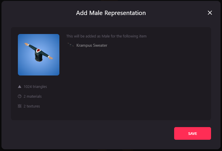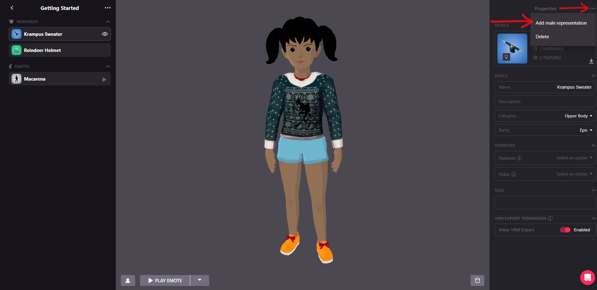 If your wearable has a different representation for male and female you will need to upload another file. So far, you only have one uploaded. In the example, it was the female version of the Krampus Sweater. To add the other representation, click on the three dots (…) at the top right, next to Properties and select Add male/female representation. In the example below, we needed the male version.