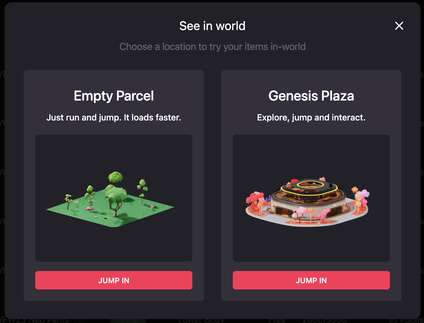 After clicking the following pop up is going to appear. Selecting Empty Parcels will teleport you to a place without too much content, which will load faster. Selecting Genesis Plaza will take you to the main plaza.