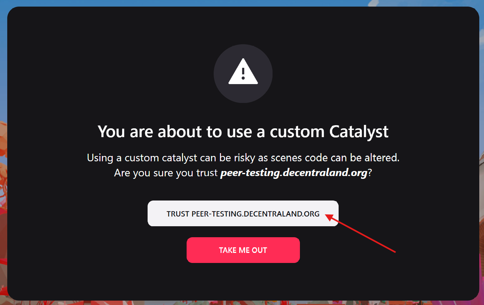 Click on TRUST PEER-TESTING.DECENTRALAND.ORG and a pop-up will show up. Simply click on Open Decentraland. To test your wearable, go to the backpack and equip it.